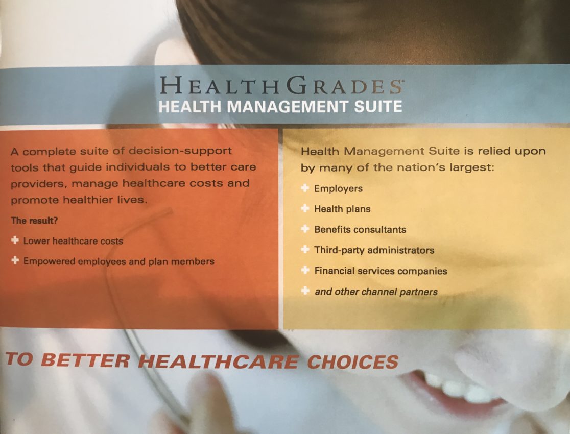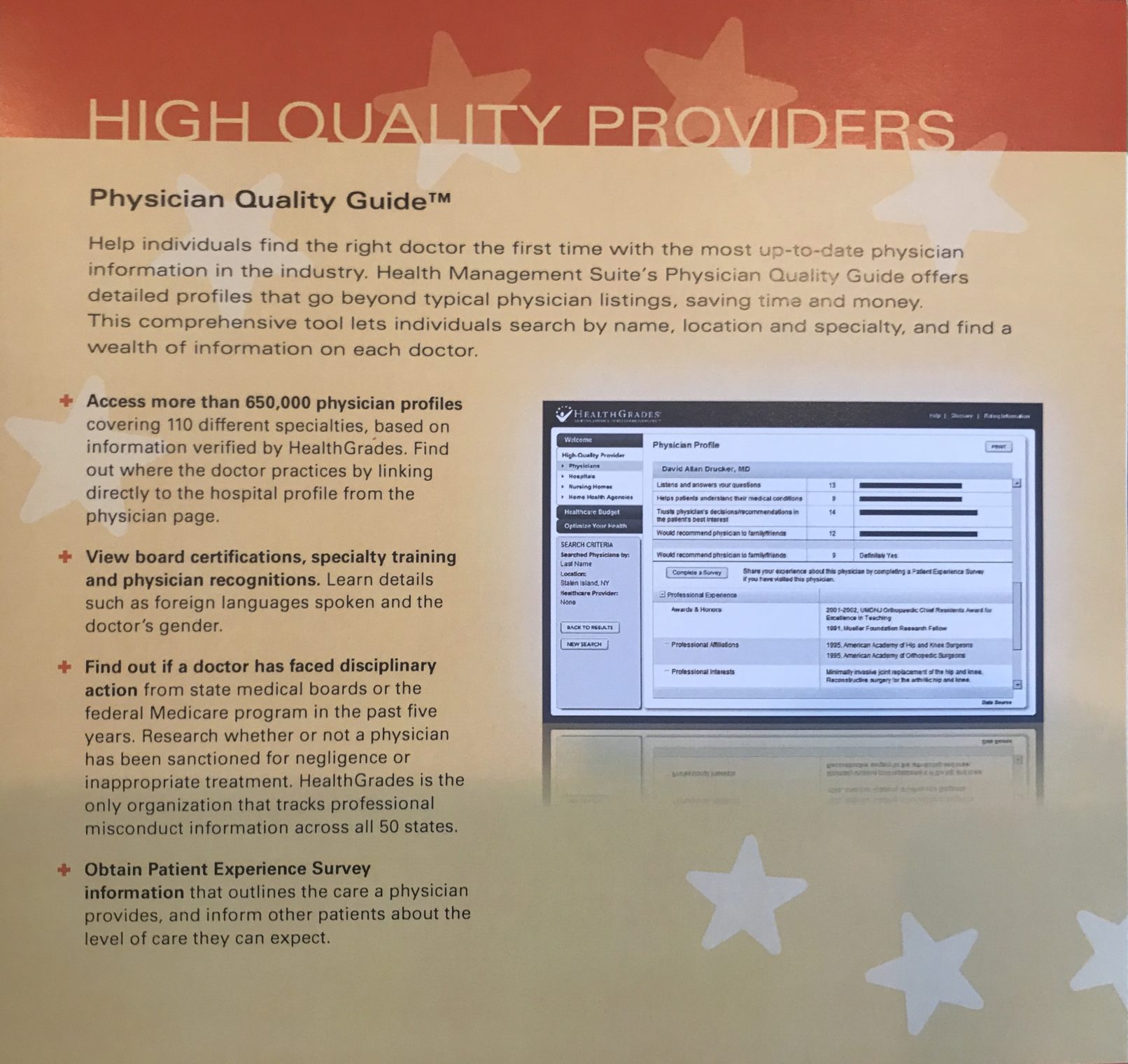 I created a high-end brochure for HealthGrades sales executive to use during presentations with potential clients, and to leave with their top prospects. The brochure features a product powered by HealthGrades clinical quality information on doctors and hospitals, packaged in user-friendly web tool employees and health plan members can use to select the top quality clinicians and facilities in their local area.