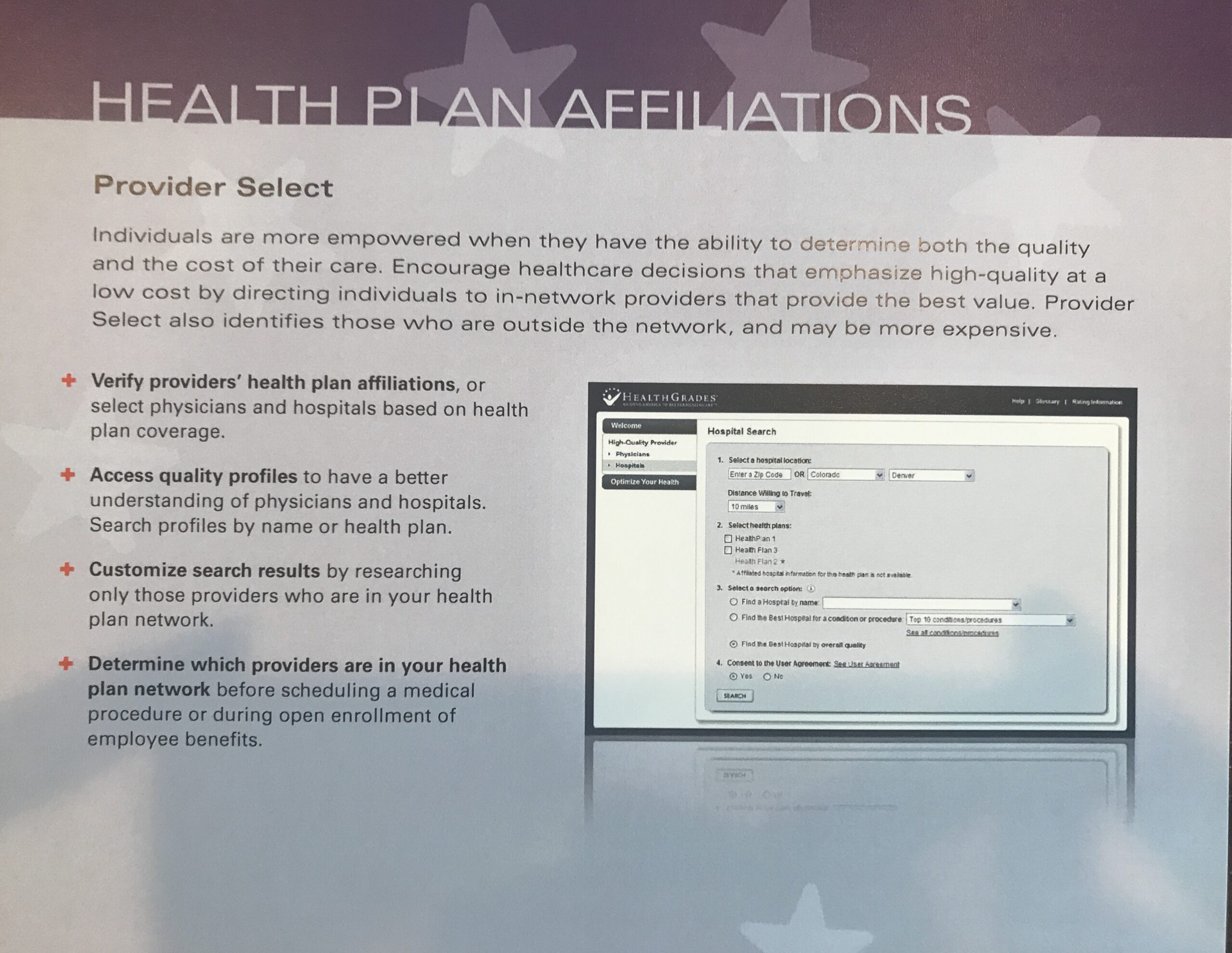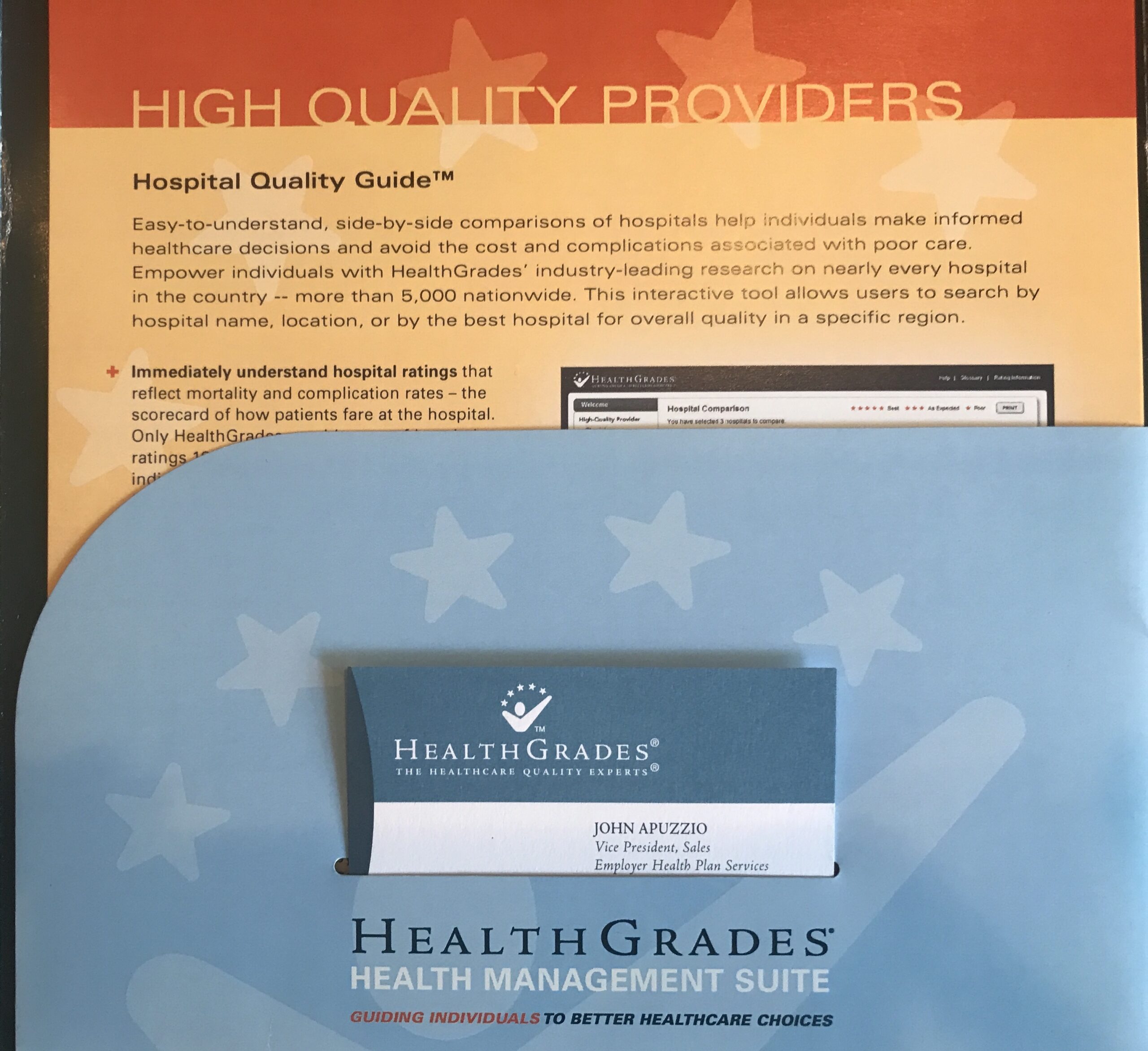 I created a high-end brochure for HealthGrades sales executive to use during presentations with potential clients, and to leave with their top prospects. The brochure features a product powered by HealthGrades clinical quality information on doctors and hospitals, packaged in user-friendly web tool employees and health plan members can use to select the top quality clinicians and facilities in their local area.